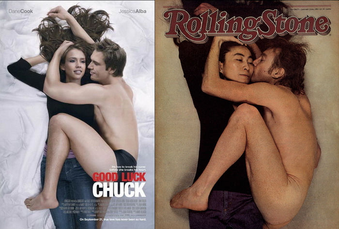 О релизе романтической комедии с Джессикой Альбой и Дэном Куком "Удачи, Чак" мы рассказывали во вчерашнем выпуске новостей Бокс Офиса, а сегодня мы предлагаем вам найти пять отличий между рекламным плакатом фильма и считающейся классической обложкой журнала Rolling Stone 1981 года с Йоко Оно и Джоном Ленноном.