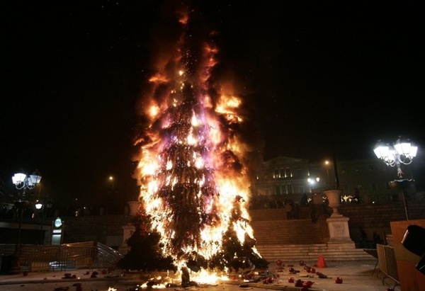 На площади перед парламентом хулиганы подожгли рождественскую ель.