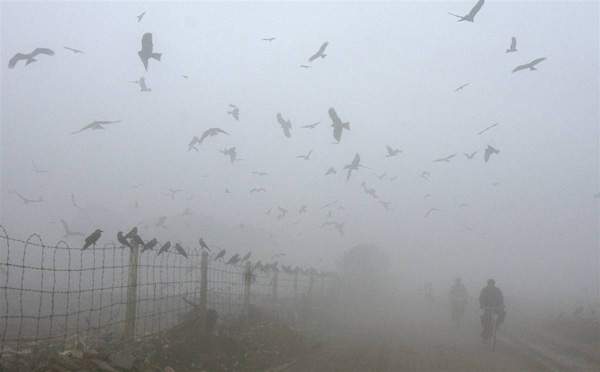 Люди едут на велосипедах по все той же туманной Индии. Ajay Verma / Reuters