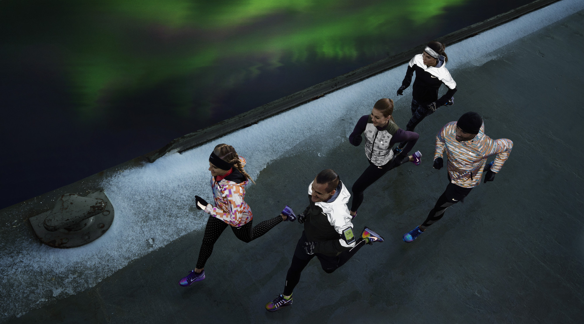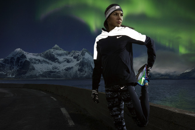 Разрабатывая обновление светоотражающей экипировки Flash Pack дизайнеры Nike искали вдохновение в этой самой романтике бега поздней осенью и зимой. Многие любят бег в это время года за ощущение умиротворенности и ночные виды улиц, святящихся окнами, рекламным неоном, фарами автомобилей. Именно световые эффекты, и в частности самое зимнее и самое красивое из них – северное сияние, и стали главной темой дизайна коллекции.